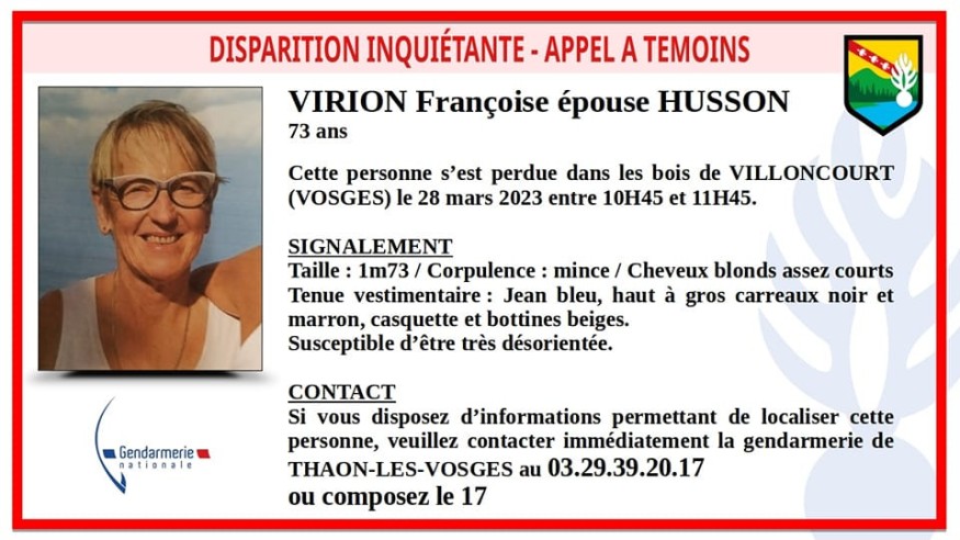 La Gendarmerie des Vosges a lancé ce mercredi un appel à témoin suite à une disparition inquiétante. Il semblerait que Françoise Virion (épouse Husson) se soit perdue dans les bois de Villoncourt ce mardi matin. Elle mesure 1m73 et est de corpulence fine. Elle a les cheveux courts et blonds. Elle portait un jean bleu, un haut à carreau et des bottines lors de sa disparition. Si vous avez des informations contactez la gendarmerie de Thaon-les-Vosges.
