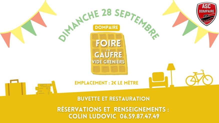 Une idée de sortie gourmande à Dompaire ! Dimanche, c'est le retour de la traditionnelle Foire à la Gaufre, en marge du vide-greniers qui est en bonne voie pour battre son record d'exposants ! Un événement organisé par l'ASC Dompaire et qui vous attend nombreux. Le programme dans les Bonnes Idées Vosges FM avec Jean-Marc Mulot, président de l'ASC Dompaire.