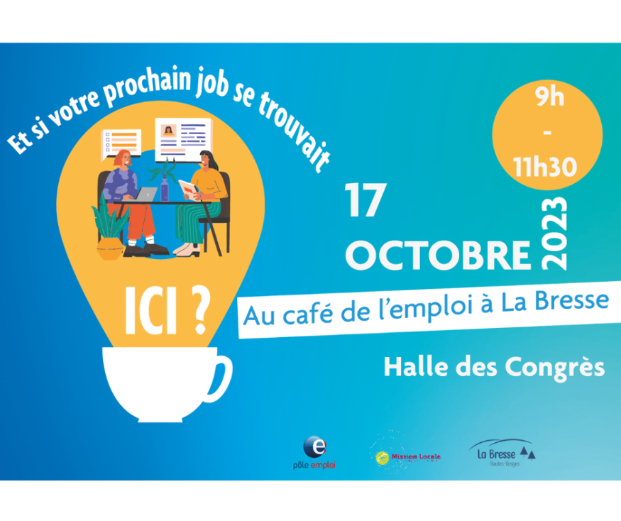 Le café de l'emploi se tiendra à la halle des Congrès de la Bresse le mardi 17 octobre de 9H00 à 11H30! Plusieurs entreprises seront présentes pour vous aiguiller et peut-être vous proposer des CDD ou des CDI!