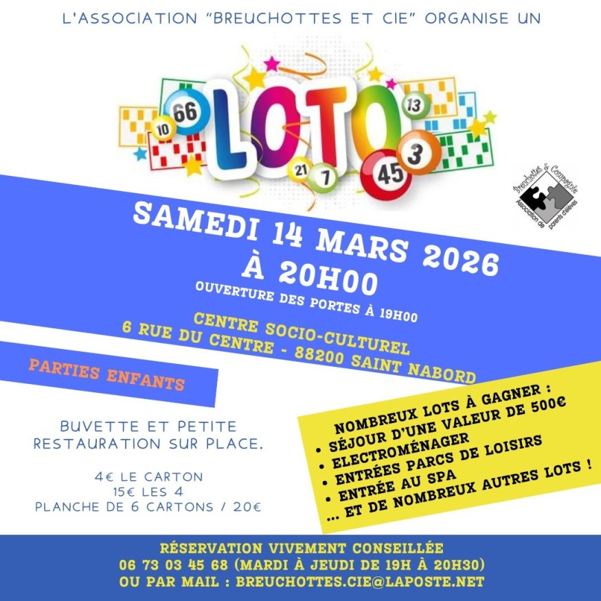 Et si vous tentiez votre chance ce samedi à Saint-Nabord ? L'association de parents d'élèves "Breuchottes et Compagnie" vous attend nombreux à son grand loto ! Avec de nombreux lots à gagner, dont un séjour d'une valeur de 500 euros, de l'électroménager ou encore des entrées au SPA. On vous dévoile le programme dans les Bonnes Idées Vosges FM, Cécile Jacquot accueille Céline Demontant, présidente de l'association Breuchottes et Compagnie.