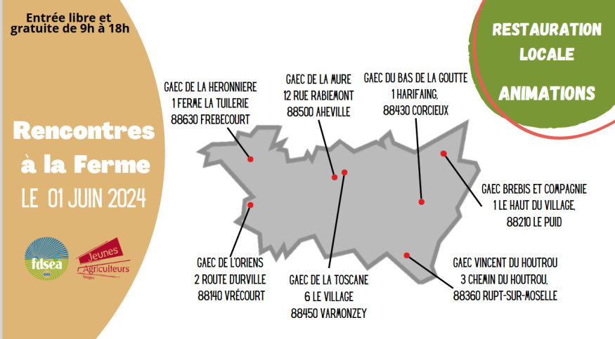 C'est parti pour une nouvelle édition de "rencontres à la ferme"! Découvrez comment est produit ce que vous retrouvez dans vos assiettes. Différents temps forts vont rythmer ces journées, dont l'inauguration le vendredi 31 mai au GAEC de la Toscane à Varmonzey. D'ailleurs, Vosges FM sera en live à la même date de 9H00 à 12H30! Vous avez également rendez-vous les 1er et 2 juin dans ces sept exploitations!