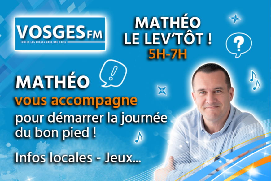 Le monde appartient à ceux qui se lèvent tôt... et à ceux qui écoutent Vosges FM ! De 5h à 7h, Mathéo vous accompagne pour démarrer la journée du bon pied. Un programme matinal qui allie informations locales et jeux pour vous réveiller tout en douceur.