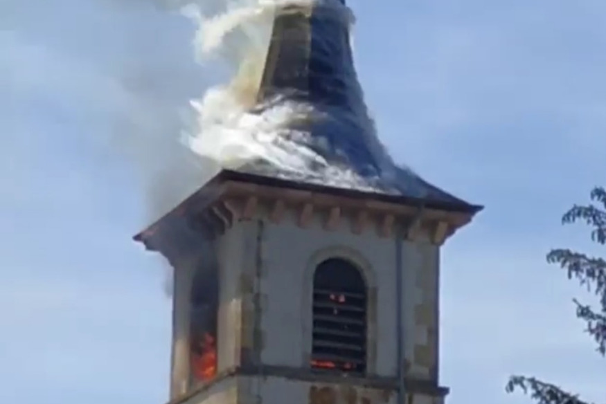 Le clocher de l'église de Gugnécourt en feu