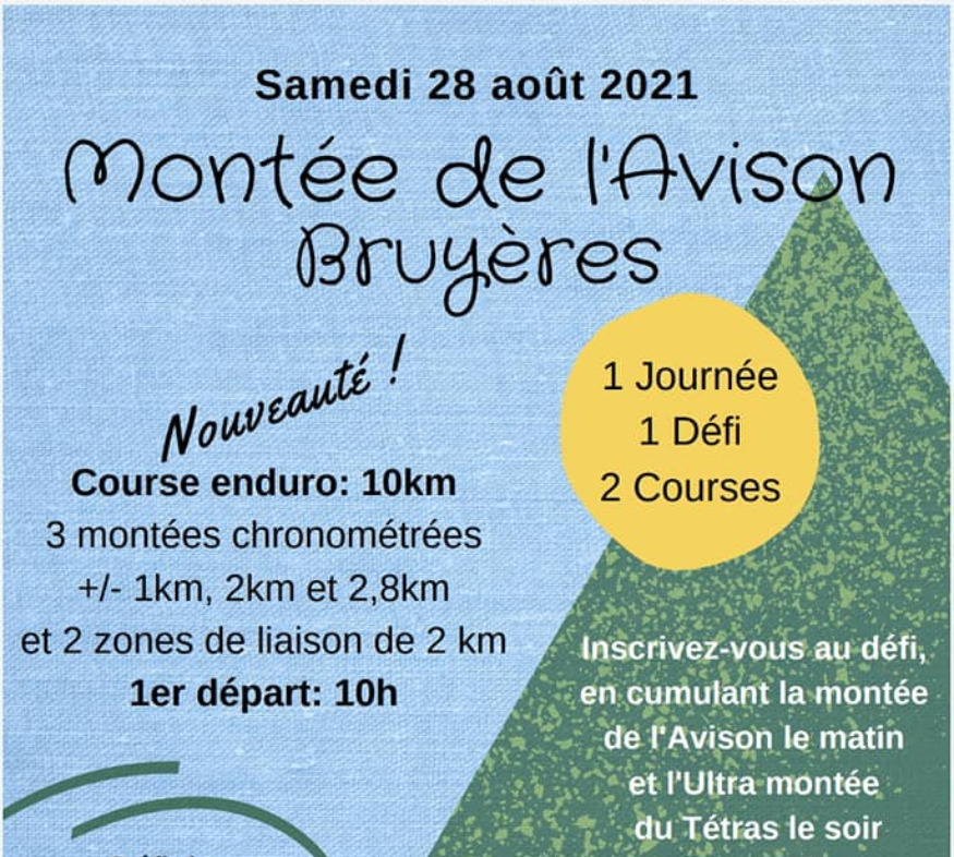 Cette année, l’Athlé-Vosges Bruyères organise la montée de l’Avison le Samedi 28 août 2021. Le parcours d’une dizaine de kilomètres, sera divisé en plusieurs zones. Le chronométrage sera comptabilisé sur 3 tronçons, et ce sont ces temps additionnés qui permettra de réaliser le classement des coureurs. Les 3 premiers recevront une coupe en récompense !