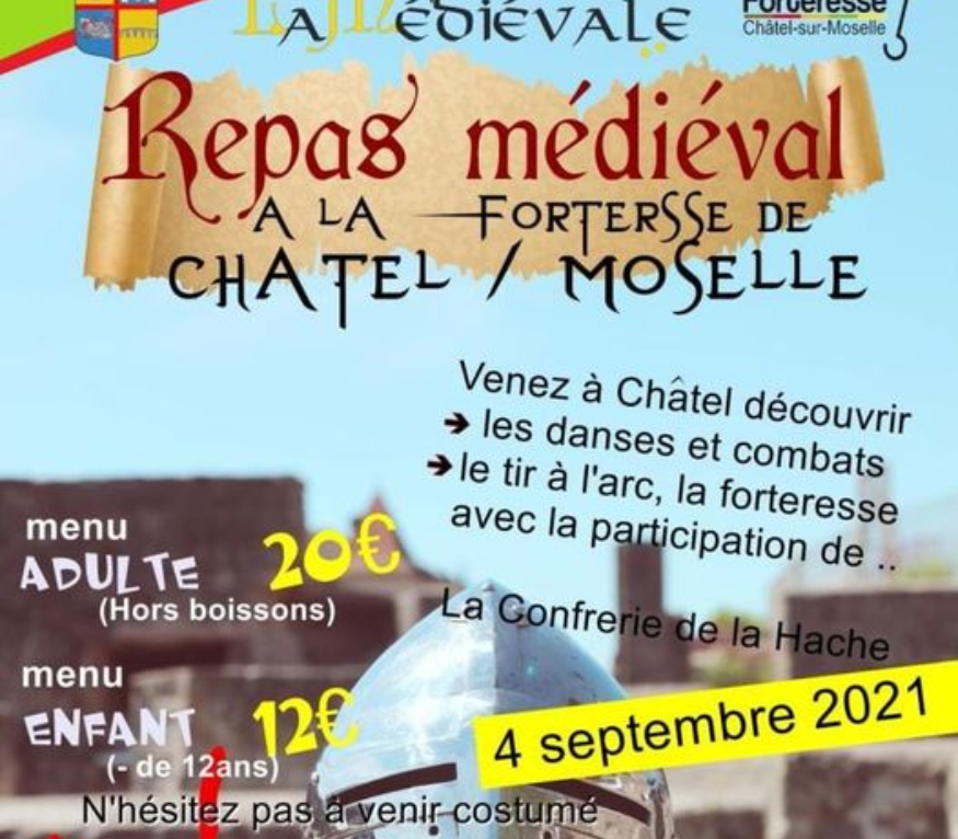 L'association "la médiévale" organise un repas médiéval à la Forteresse de Chatel sur Moselle le 4 septembre. La soirée sera ponctuée de diverses animations, notamment des démonstrations de danses, de combats ou encore de tir à l'arc. A partir de 18h vous pourrez visiter la Forteresse de Chatel sur Moselle et le repas débutera à 20h, avec un menu complet comprenant des crudités en entrée, un poulet au miel et légumes d'antan et un dessert, sur réservations. L'apéritif et le café sont offerts. Pass sanitaire obligatoire.