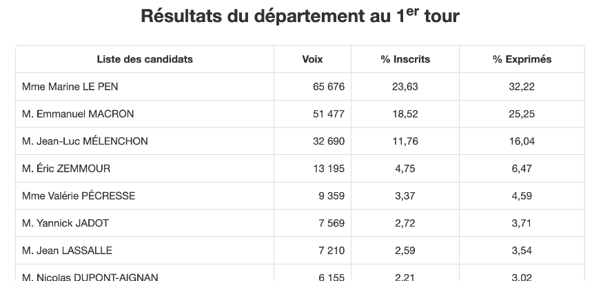 Présidentielle dans les Vosges …. Contrairement aux chiffres nationaux, Marine Le Pen est en tête du premier tour dans les Vosges. Elle recueille 32,22 % des suffrages devant Emmanuel Macron à 25,25%. Jean-Luc Mélenchon arrive en troisième position avec 16,04%