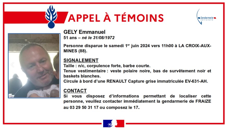 Emmanuel Gely est proté disparu depuis le samedi 1er juin sur le secteur de La-Croix-aux-Mines. Âgé de 51 ans, l'homme n'a pas donné signe de vie depuis. Il est de corpulence forte, a une barbe courte. La dernière fois qu'il a été vu, il portait une veste polaire noire, un bas de survêtement noir et une paire de baskets blanches. Il aurait été aperçu dans un Renault Capture gris, immatriculé EV-631-AH.
