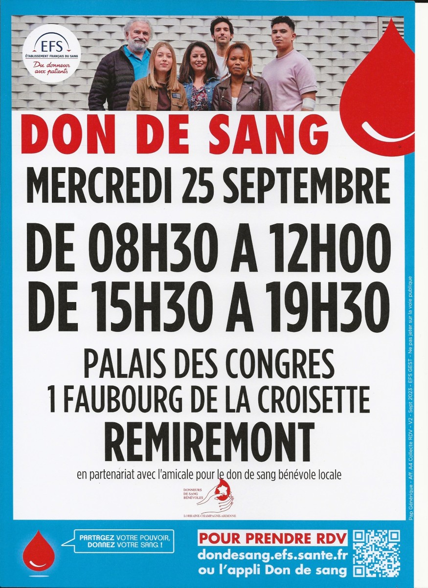 Donnez son sang, ça sauve des vies ! L'EFS et l'amicale ADSB Remiremont & environs organisent une collecte de sang à Remiremont au palais des congrès :
