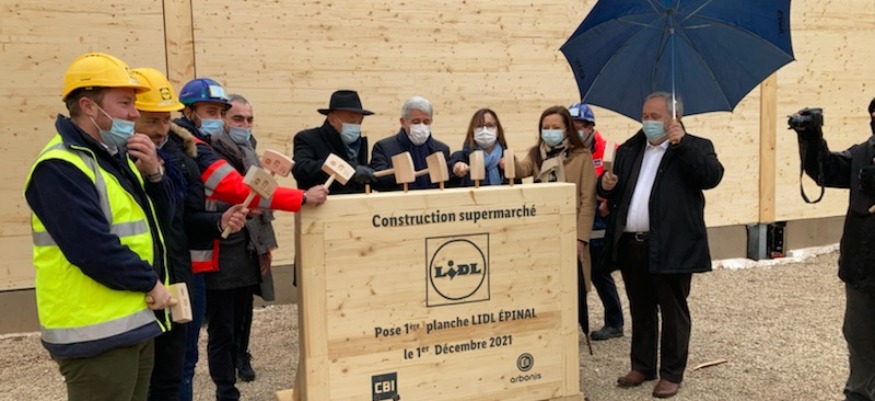 Un nouveau supermarché sort de terre à Epinal...et tout en bois ! Il sera dans le réseau des magasins du discounter allemand Lidl. Hier, a eu lieu rue d’alsace non pas la pose de la première pierre mais de la première planche. La cérémonie s’est déroulée en présence du maire d’Epinal Patrick Nardin et d''autres élus.