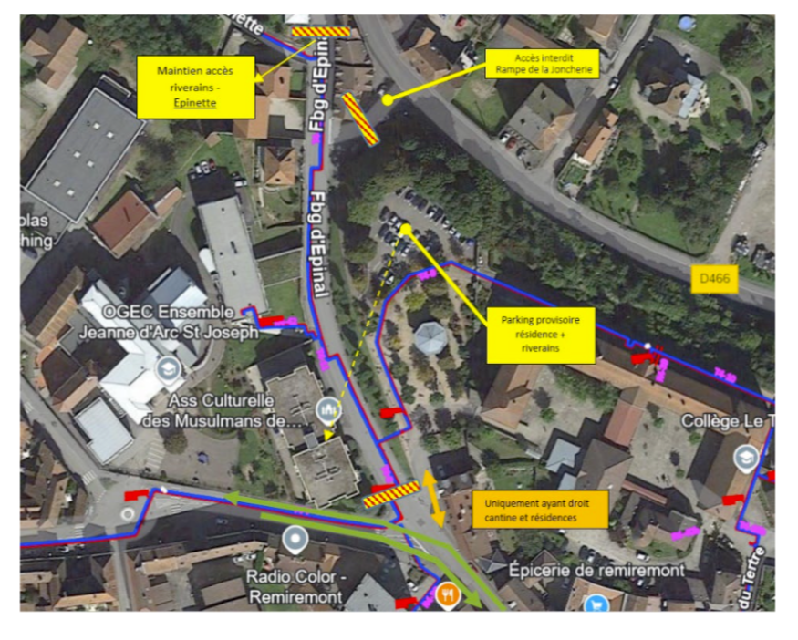 En conséquence, la circulation et le stationnement seront interdits dans la portion du Faubourg d'Epinal comprise entre la Rue du Canton, la Rampe de la Joncherie et le Chemin de l'Epinette.