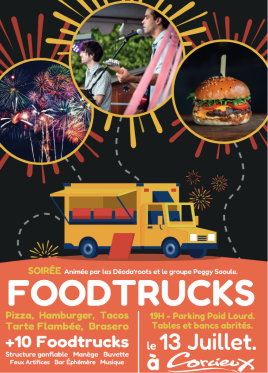 Une soirée à ne par louper à Corcieux: ce jeudi 13 juillet! De la musique, de quoi se régaler avec une dizaine de footdtrucks, des animations, et le bouquet final: les feux d'artifices!