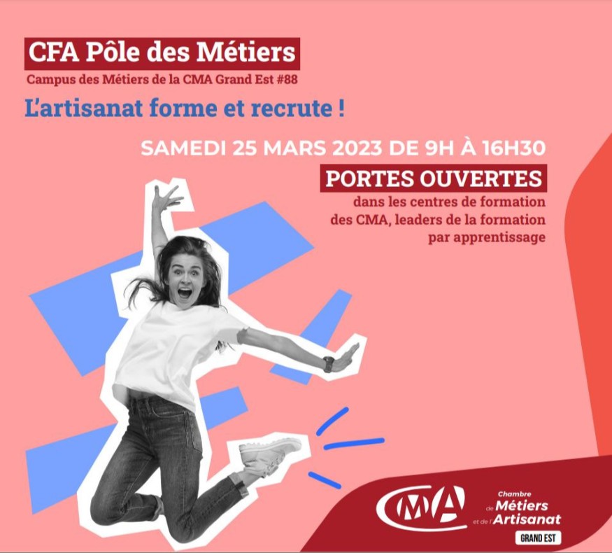 La CMA vous invite aux portes ouvertes du CFA pôle des métiers d'Epinal. Automobile, commerce, métiers de bouche, soin de la personne, préparation en pharmacie, Séverine Colle, responsable, vous donne toutes les indications dans ce podcast. Attention: des surprises vous y attendent! Rendez-vous ce samedi 25 mars de 9H00 à 16H30!