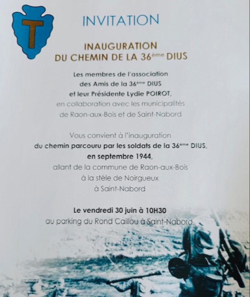 L'association "les amis de la 36e DI US" vous invite à l'inauguration du chemin parcouru par les soldats en septembre 1944, allant de la commune de Raon-aux-Bois à la stèle de Noirgueux à SAint-Nabord.